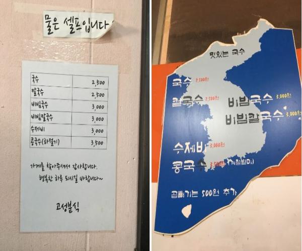 고성분식의 메뉴는 칼국수, 비빔칼국수, 국수, 비빔국수, 수제비 등으로 2,500~3,000원 내외로