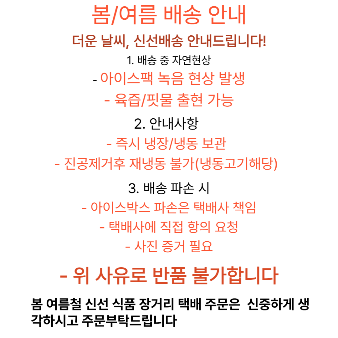 제조일로부터 진공포장소비기한15일 받는즉시냉장보관시0°도~-2°도 보관 냉동 보관시-18°보관 제조일로부터 냉장보관시15일안에 드시고 냉동보관시 180일안에 드세요 충분히가열하여 드세요 고시정보기준을중수하여 이력번호및 소비간 개별붙착