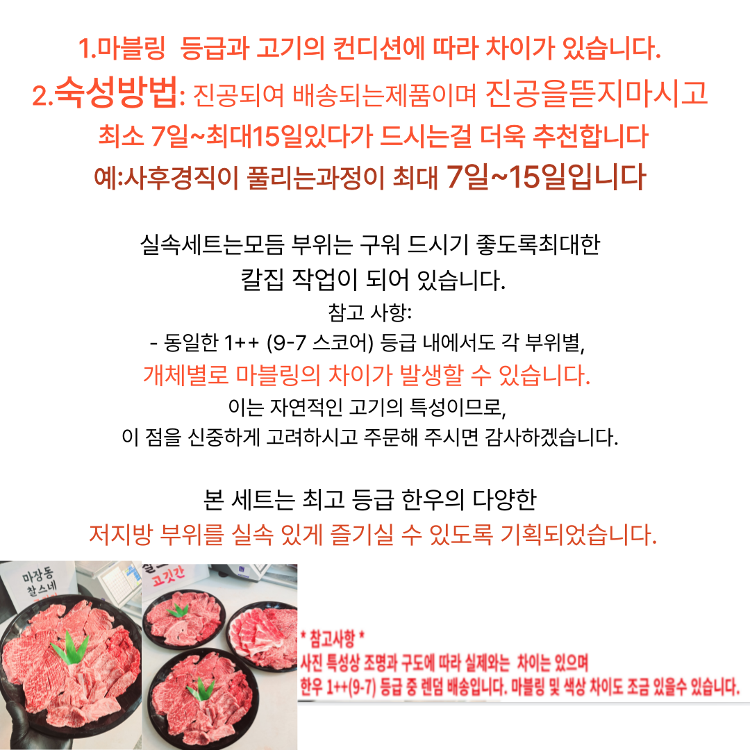 (유전자변형농수산물) "유전자변형 ㅇㅇ포함 가능성 있음" 문구 (축산물 이력번호) 이력번호 표시 또는 "이력번호가 표시된 제품이며, 이력번호는 상품 패키지에서 확인 가능합니다" 등의 문구 (소고기 등급) 1++(7-9)등급 돼지고기1등급 (수입 농수축산물) "수입식품안전관리 특별법에 따른 수입신고를 필함" 문구